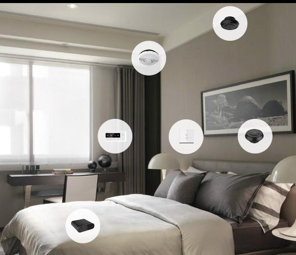 实现的功能有:通过环境监测系统以及照明调节系统,为卧室打造健康、舒适、高效的休息环境,提高睡眠品质。清晨自动打开窗帘,中午调节室内温度,晚上手机控制电视,夜晚一键关闭设备,伴随着美妙的音乐入睡.....
