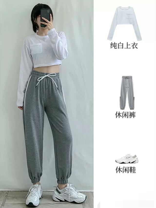 可能很多人日常都会这么搭吧,那不就又变得普通了,才不是呢,仔细观察你会发现,上衣的款式是短款的,裤子的款式是高腰的,和我们平常穿的不一样,短款的上衣和高腰的裤子都提高了腰线,使我们的整体身高,看起来很高挑,如果想再特别一点,还可以将上衣向上塞一塞,露出小肚子,这样一下就能变得特别起来,还能引来很多关注度呢。